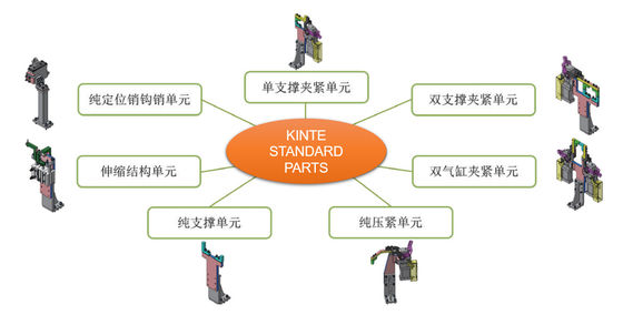 Τα τυποποιημένα μέρη Kinte περιλαμβάνουν το τυποποιημένο υποστήριγμα γωνίας μετωπών, το τυποποιημένο πιάτο μετρητών, και τον τυποποιημένο φραγμό εντοπιστών. Τα τυποποιημένα μέρη σχεδιάζονται αυτόματα με parameterization, συμπεριλαμβανομένων ποικίλων κοινών προδιαγραφών. Σύμφωνα με τις παρούσες απαιτήσεις σχεδίου να επιλεχτούν τα τυποποιημένα μέρη των προδιαγραφών αντιστοιχίας, να κοντύνει πολύ τον κύκλο σχεδίου & κατασκευής προσαρτημάτων, ώστε να ο κύκλος παράδοσης προσαρτημάτων.
